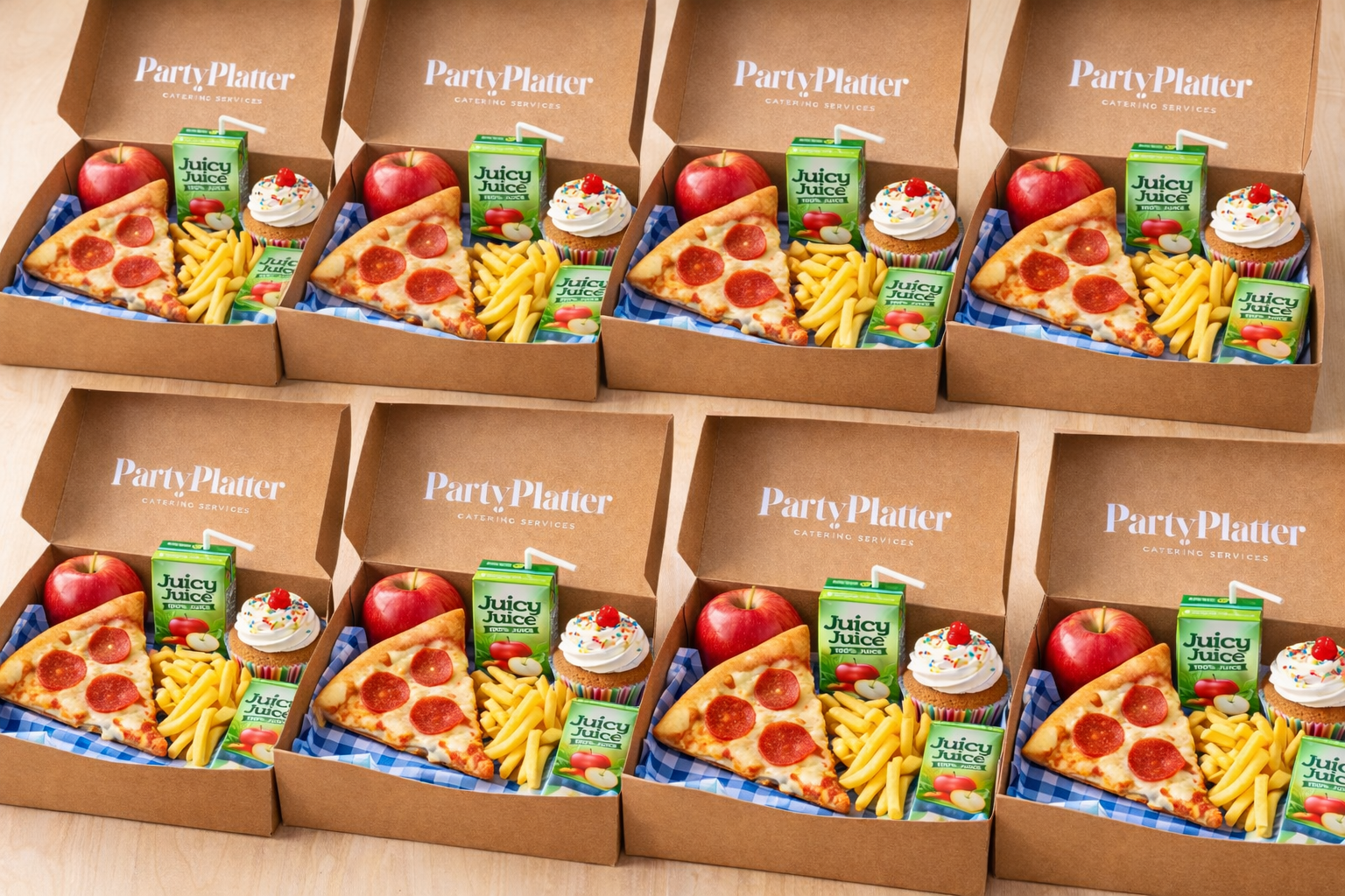 A fun and filling kids’ party meal! Includes a cheese or pepperoni pizza slice, golden fries, fresh fruit, a sweet cupcake, and a juice box—perfect for birthdays and celebrations.